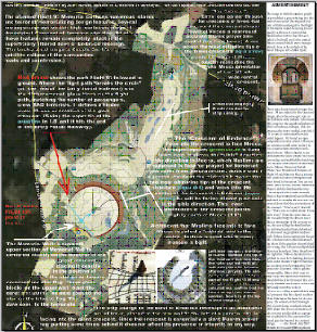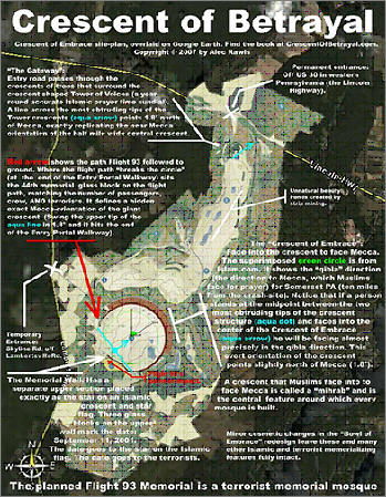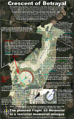 Full color high resolution map of Islamic and terrorist memorializing features superimposed on crescent site-plan, along with text explaining how the Johnstown Tribune Democrat suppressed its own fact checking in order to use known-to-be-misled Flight 93 family members to block for the hijacker. (My Error Theory post about the Trib-Dem's abuse of the family members here.)