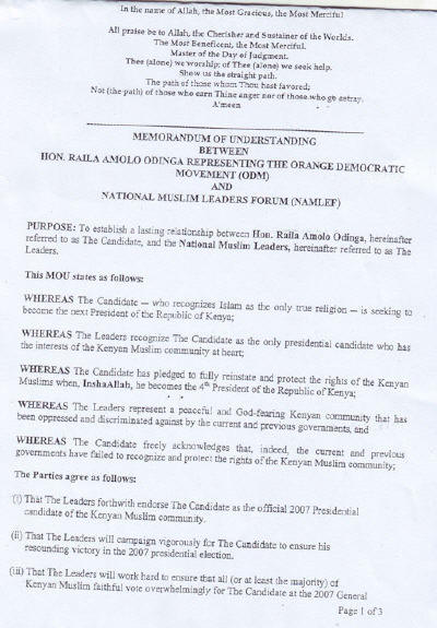 Copy of Odinga's old Raila Odinga for President web page, giving Odinga's explanation for the Memorandum Of Understanding he signed with Muslim leaders, declaring Islam to be the only true religion and promising to impose Sharia law on Kenya if elected. As of March 2009, Odinga cancelled this old campaign website from 2007-8. I am posting this copy so that people can see that he admitted on his own website that he signed the MOU. This is well known in Kenya of course, where Muslim leaders bragged about it (which is why Odinga needed to offer an explanation), but people in the west might not know that Odinga's signing of the MOU is an established fact, admitted by Odinga himself.