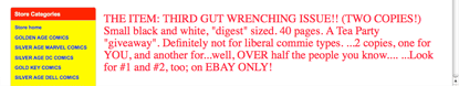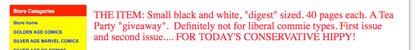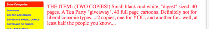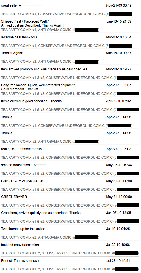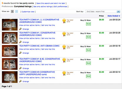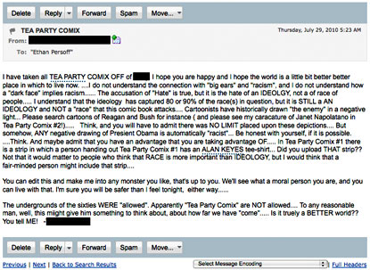 I have taken all TEA PARTY COMIX OFF of [Internet marketplace]. I hope you are happy and I hope the world is a little bit better better place in which to live now. ....I do not understand the connection with "big ears" and "racism", and I do not understand how a "dark face" implies racism...... The accusation of "Hate" is true, but it is the hate of an IDEOLGY, not a of race of people..... I understand that the ideology has captured 80 or 90% of the race(s) in question, but it is STILL a AN IDEOLOGY and NOT a "race" that this comic book attacks.... Cartoonists have historically drawn "the enemy" in a negative light... Please search cartoons of Reagan and Bush for instance ( and please see my caracature of Janet Napolatano in Tea Party Comix #2! )..... Think, and you will have to admit there was NO LIMIT placed upon these depictions.... But somehow, ANY negative drawing of Presient Obama is automatically "racist"... Be honest with yourself, if it is possible. ....Think. And maybe admit that you have an advantage that you are taking advantage OF..... In Tea Party Comix #1 there is a strip in which a person handing out Tea Party Comix #1 has an ALAN KEYES tee-shirt... Did you upload THAT strip?? Not that it would matter to people who think that RACE is more important than IDEOLOGY, but I would think that a fair-minded person might include that strip....