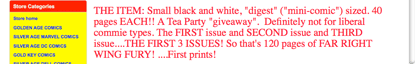 The undergrounds of the sixties WERE "allowed". Apparently "Tea Party Comix" are NOT allowed.... To any reasonable man, well, this miight give him something to think about, about how far we have "come"..... Is it truely a BETTER world?? You tell ME! - [name redacted ]