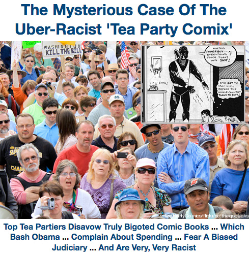 Easily the highlight of the weekend comes from Talking Points Memo securing two denials (Ding! Ding!) from authentic Tea Party organizations. We're clearly never going to get any traction in the way of their endorsing hateful Tea Party literature, so taking the Bizarro-view we thank them for the acknowledgement, and knowing what acknowledgements mean in politics, we thank them for the validating denial.