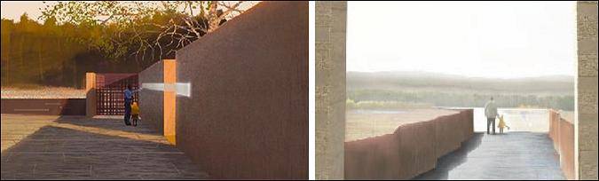 Left image: The Memorial Wall, traces flight path just above the point of impact. The white line at eye level is a set of 43 glass blocks, 40 to be inscribed with the names of my son and the other passengers and crew, and three (on the near side of the gap) to be inscribed with 9/11 date. Right image: At the upper crescent tip, at the end of the Entry Portal Walkway, sits a huge glass block, the 44th glass block on the flight path. It marks the spot where, in the architect’s description, the terrorists broke our humanitarian circle, turning it into a giant (Islamic shaped) crescent. Inscription: “A field of honor forever.”
