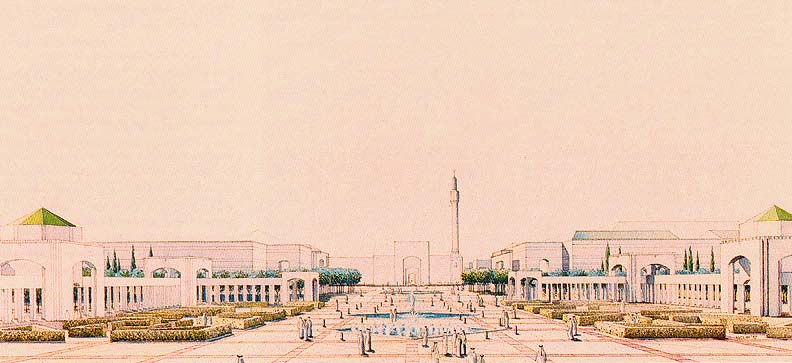 Arthur Erickson's architecture firm (where Murdoch interned in the early 80's) has changed its website and it no longer contains the "islamic university of madinah" page that features a giant outdoor mihrab/mosque. Murdoch got his masters in architecture degree from UCLA in 1984. His website says he interned with Erickson, which was likely a summer thing while he got his masters degree, so probably 1982 or 1983. Erickson's "islamic university" page says "designed 1983 with frank e. basil & dar al riyadh," so it is possible that Murdoch got exposed to mosque architecture, and the idea of a giant outdoor mosque, here. Since the page is no longer up at Erickson, I figured I had better grab a copy of it from the Wayback machine. Here is the link for Wayback's 12/3/2008 "islamic university" capture: